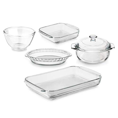 Includes 1,9-inch by 13-inch glass bake dish; 1,8-inch by 8-inch glass bake dish; 1,9.5-inch glass deep pie plate; 1,2-quart glass mixing bowl; and 1,2-quart oval glass casserole with glass cover