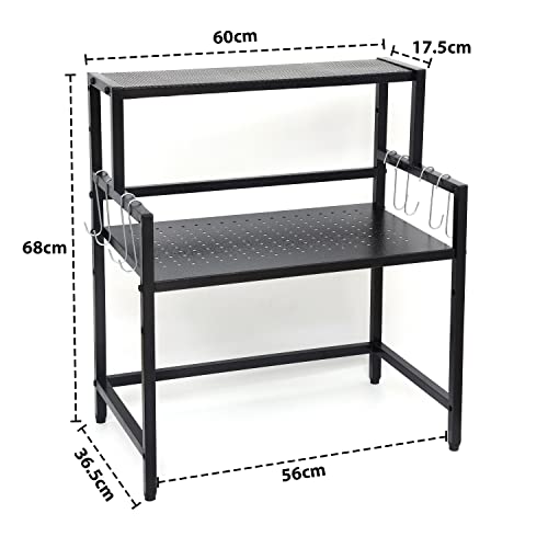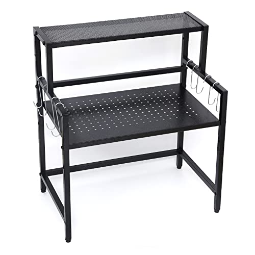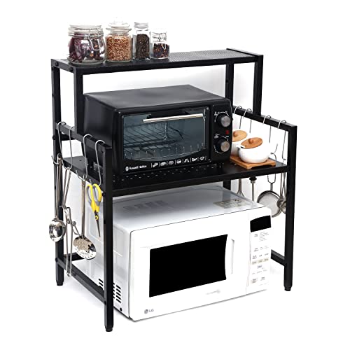 Livzing 2-Tier Microwave Oven Rack-Adjustable Microwave Stand with Hooks-Multipurpose Counter top Storage Organizer-Dish Rack for Kitchen Cabinet-Powder Coated OTG and Microwave Rack–Black