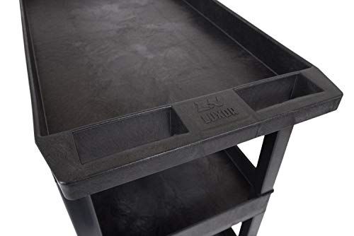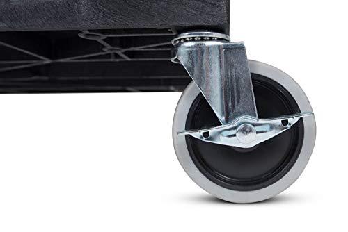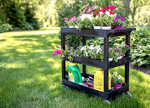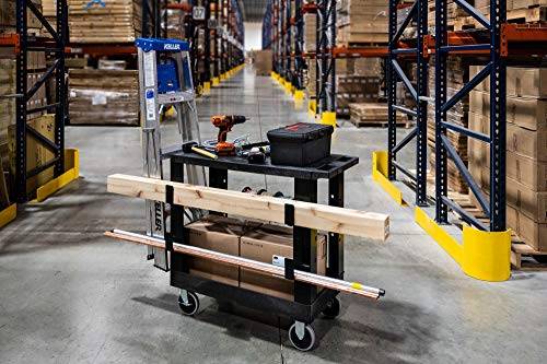 Has an ergonomic push handle molded into the top shelf. Four 4″ full swivel casters, two with locking brake.