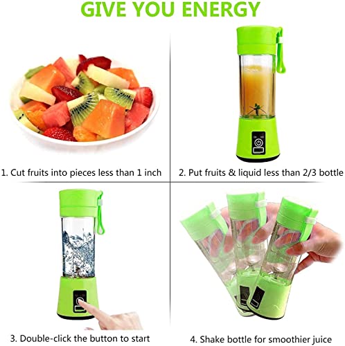 Portable & Compact, Convenient to Charge USB Juicer Blender : Innovative juicer cup, 2 in 1 design, a water bottle and also a juicer, Light weight is easy to Carry to School, Office, Parks, Gym, Yoga, Zumba, Aerobics Sports Coaching classes Camping anywhere you want to and it also convenient for charge by power bank, laptop, computer, car or other usb devices. It has 4-blade 304 stainless steel blade on the bottom of bottle, so that you can make a cup of fresh and delicious juice by yourself. Perfect for travelling, business trip or other outdoor activities use. Product instructions: Please allow the motor to cool for some time between product uses Burning smell during first few usage is normal due to varnish coating on motor and will stop after few usage cycles. Please Read Instructions given before operation Easy and Safe Cleaning – It has have smart safety protection device, magnetic sensing switch ultra safe to use and clean, the juicer cup’s Food Grade PP body and ABS bottom can be separated, you can easy to clean it . Multi-function – Natural tasty juice, milkshake, smoothie and other baby food protein shake, How to Use: 1) Firstly Cut fruits(Only Citrus/ Juicy and please remove hard shell/skin of Fruits/Vegetables) into small approx. 1.5*1.5 cm and Open cap of juicer bottle and fill bottle about 60% with cut pcs. Now just add water or milk or honey About 20% So fill total 80% of the Cup capacity as per your necessity. double press the switch to start, single press to stop, it will auto stir and mix, DIY juice. Turn on juicer bottle and let’s start blend fruit. Allow 1 min to blend to get juice. Now its ready, Just serve it in wine glass and enjoy. Product Detail: Color : Multi (random color will be shipped) Capacity : 380 ml Battery Capacity : 2000 mAh Lithium battery Motor Model : DC 3.6V Charging Time : About 3 Hours Full Charge Working Current:10-12 Amp. Using times : 10-12 times Idle Protection : Turn Off in 5-7 sec