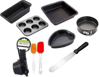 - MAFAHH Package Contains:- Round, Heart, and Square Shape Cake Mould With 6 Slot Muffin Tray and Bread Loaf Pan with 8 Pcs Measuring Cups and Spoons, Brush Spatula Set with Cake Knife | Material: Teflon Coated Metal | Color: Black | Easy to clean.