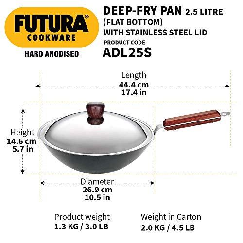 Package Contents: 1-Piece Futura Hard Anodised Flat Bottom Deep-Fry Pan with Steel Lid (26cm/2.5 Litres) Warranty Information: 5 Years