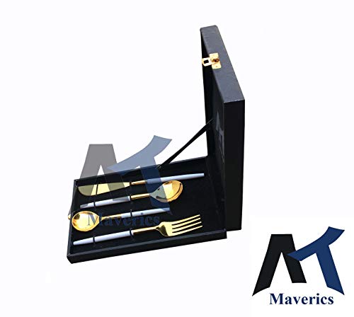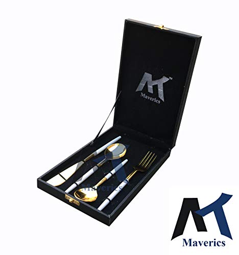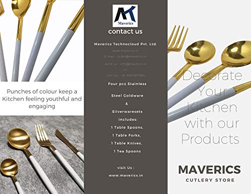 Maverics 4 Pieces Classic Design Royal Flatware Cutlery Set, Polished Classique (Contains Desert: 1 Knife, 1 Tea Table Spoons, 1 Forks, 1 Soup Spoons) (Gold & White)
