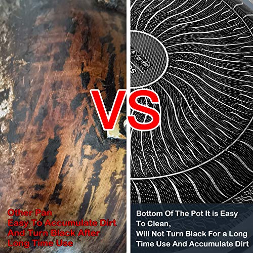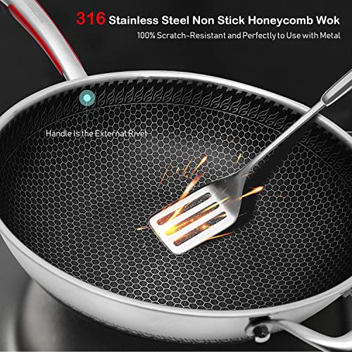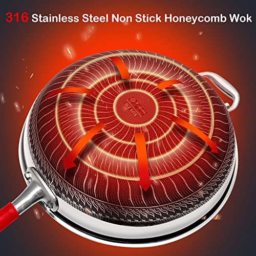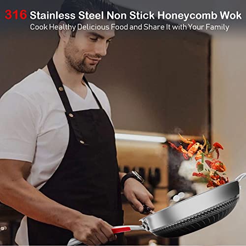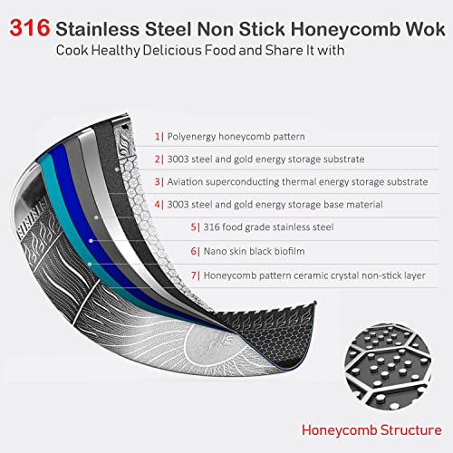 ★Woks & Stir-Fry Pans Bottom Adopts High-Precision Micro:Engraving Technology,Which Can Be Heated Uniformly And Rapidly,Has Honeycomb Structure Design And Uniform Distribution,Which Improves The Non-Stick Property Of The Wok Bottom. Pan Bottom Is Not Deformed And Is Not Easy To Blacken And Yellow After Long-Term Use.It Is Superior To The Non-Stick Property Of The Conventional Stainless Steel Wok Pan.