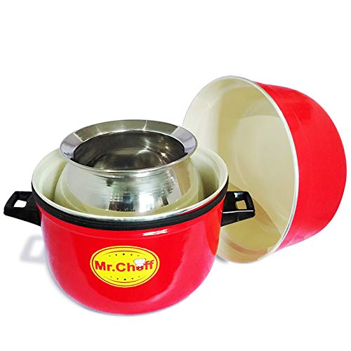 Mr.Cheff thermal rice cooker. Makes rice in an appropriate manner incorporating safety, hygiene and contamination proof cooking. The stainless steel pot inside the cooker ensures that the food is retained hot for a longer time. Do not use the thermal rice cooker on gas stove or fire.