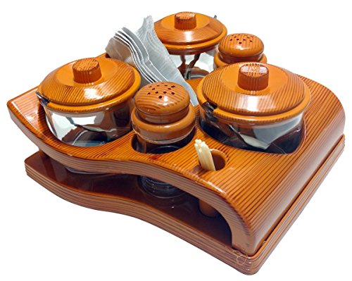 It Contains Three Pickle/Sugar Pot, Three Spoon and 2 salt and pepper dispenser placed on a well designed way and a tissue napkin holder