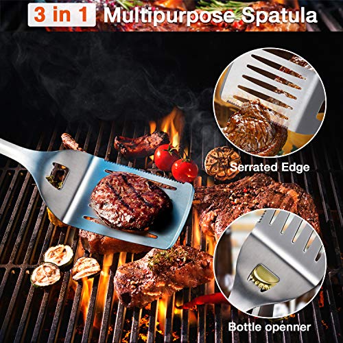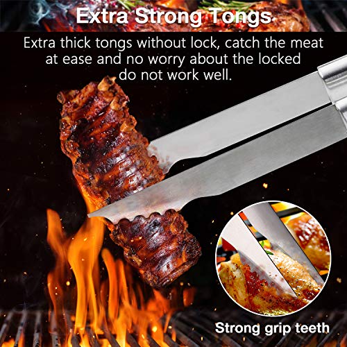 【BBQ Tools All in One】: Huge hanging loops at each grill tool, you can storage your BBQ grilling accessories set easily. You can flip a piece of beef at ease with huge spatula head; serrated cutting edge can slicing open your meat; with bottle opener built in spatula to make sure you can open you beer to cheer anytime. Super sharp fork ensure you can skewering meat quickly. Extra thick tongs with serrated edge, allows to handle the biggest food without falling down