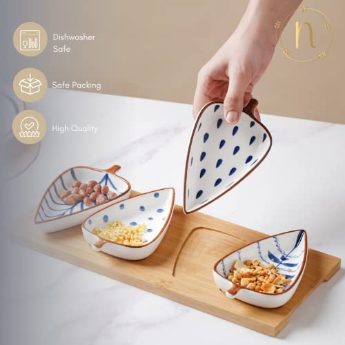 Nestasia Contemporary Leaf-Shaped Ceramic Blue and White Glossy Serving Platter with Wooden Board for Serving Sweets, Cookies, Dry Fruits and Other Snacks (Set of 1 Tray and 4 Small Plates)