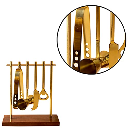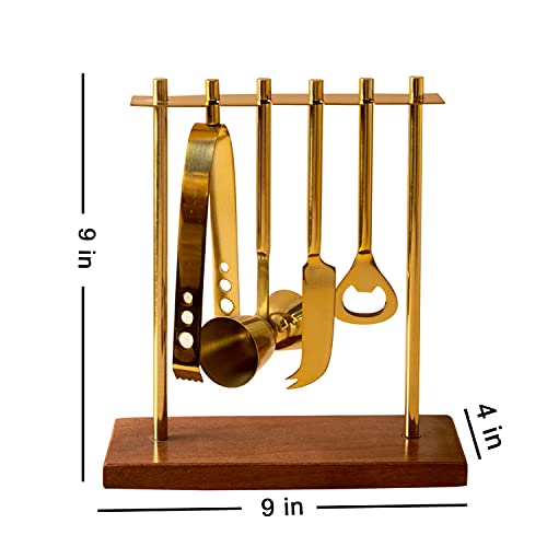 MATERIAL, DIMENSIONS & SET SIZE: [Material] Stainless Steel; [Base] Mango Wood; [Finish] Electrophotic Gold [Dimensions] 9 L X 4 W X 9 H (Inches); [Set Size] 1 Stand, 1 Ice Tong, 1 Bottle Opener, 1 Double Peg Measurer, 1 Cheese Knife.