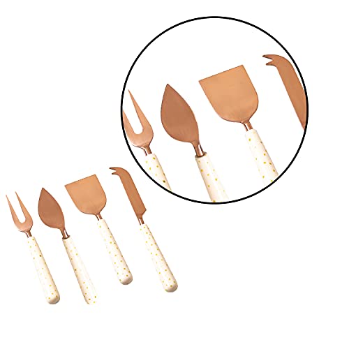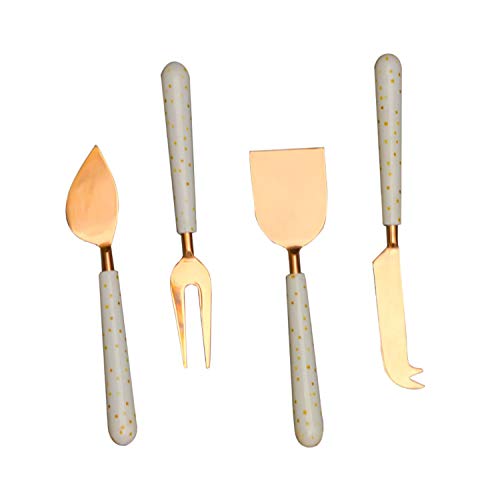 ABOUT: Cheese Knives Set of 4 – These cheese cutter knife set includes a Serving fork to hold cheese in place while you cut, sharp knife to chuck hard cheese, a serrated knife to cut medium soft cheese, a narrow plane knife to slice the softer cheese, a crumble knife to crumble cheese and a curved spreader – a complete set for all your cheeses. Multi-purpose knives makes it suitable for all cheese types. Use it for cutting Cheese or slicing pizza, pies, waffles and the like