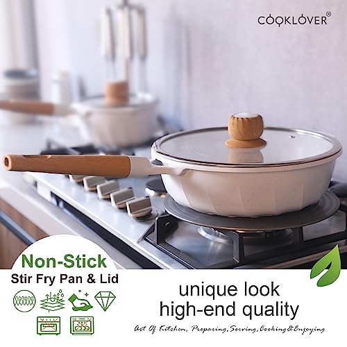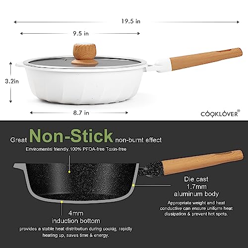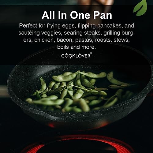 🍳ERGONOMIC BAKELITE KNOB AND HANDLE: COOKLOVER’s frying pan builds with heat resistant soft touch silicone Bakelite knob and handle with beautiful wood grain design (NOT REAL WOOD).
