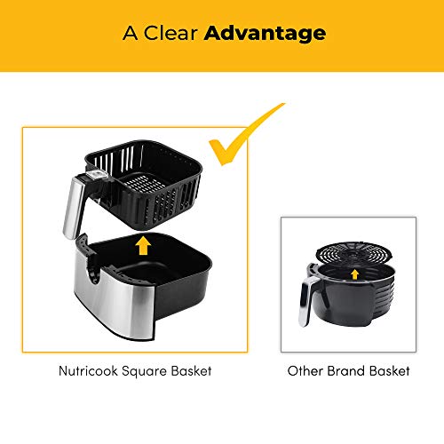 A clear advantage. Our square basket has more usable space to put more food than round design basket. Its removable non-stick coated basket is PFOA-free, BPA-free and dishwasher-safe, too