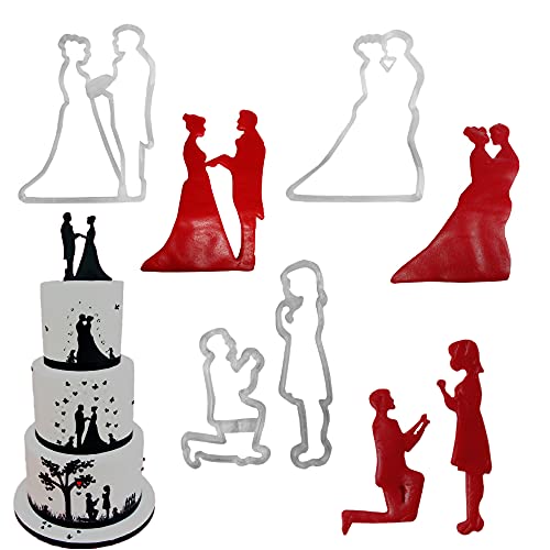 An all time popular romantic stylish, modern set of 9 silhouette cutters ideal for valentine proposal, engagement & wedding cakes. 3 designs available in a range of sizes to suit almost any size of cake and make stunning cake side designs and toppers. This set of silhouette shape cutters for sugar paste includes three designs in various sizes illustrating the journey from engagement to marriage Designed for embossing and cutting thinly rolled fondant or gum paste Made of food-grade plastic material, safe, non-toxic, reusable and durable