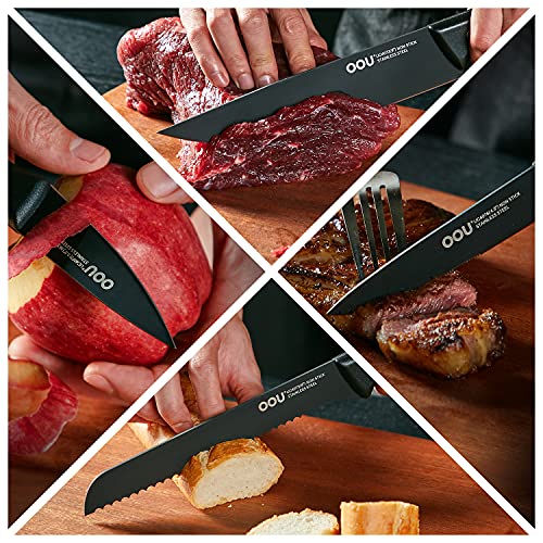 OOU! High-Carbon Stainless Steel Chef Knife , Slicing Knife , Bread Knife, Utility Knife, Paring Knife , Steak Knife , Knife Block, Kitchen Shears And Knife Sharpener, 15 Pieces, Black