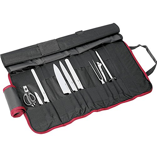 Paderno World Cuisine 9 Piece Cutlery Roll Bag with one Each Chef’s Knife, Slicing Knife, Ham Knife, Boning Knife, Paring Knife, Bread Knive, Chef’s Fork, Sharpening Steel and Kitchen Scissors