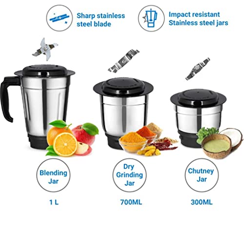 Comes with 3 High Grade SS 202 Stainless steel jars- Liquidizing jar (1.25 L), Dry or wet grinding jar (1 L) and Chutney jar (0.4 L)