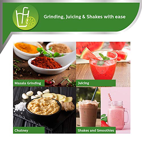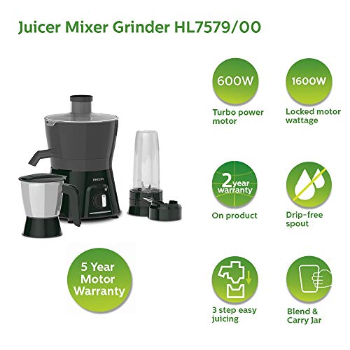 Power: 600 watts. Multi purpose jar for dry and wet grinding- tough ingredients, chutney, puree, masala, coconut etc. Includes: Includes: Juicer Mixer Grinder, 1 Nutri Juicer Jar,1 Blend&Carry jar(750 ml), 1 Multi purpose jar(750 ml), warranty card
