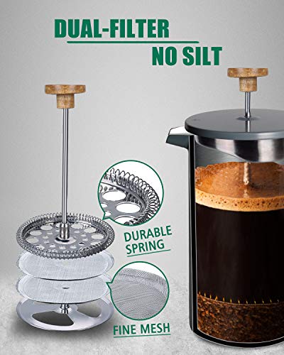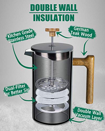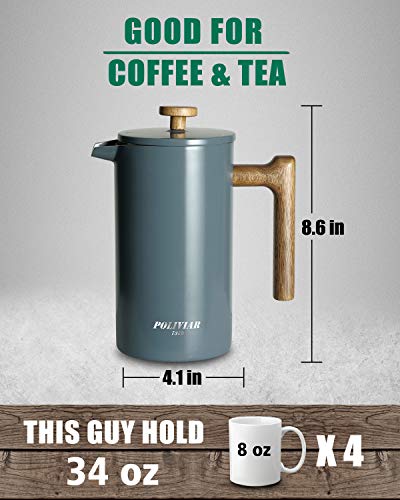 POLIVIAR French Press Coffee Maker, 34 Ounce Coffee Press with Teak Wood Handle, Double Wall Insulation & Dual- Filter Screen, Food Grade Stainless Steel for Good Coffe and Tea (Alpine)