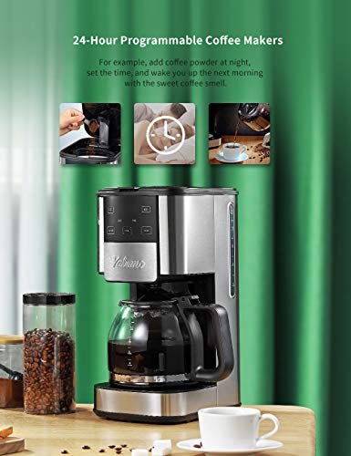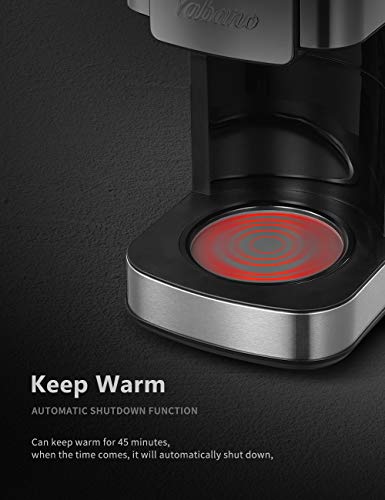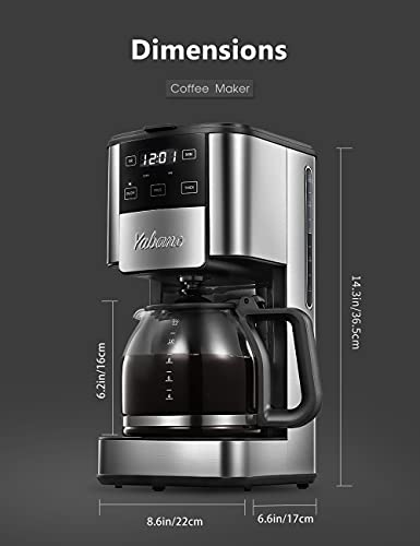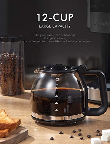 Yabano 12 cups programmable coffee maker has basic features you need. You can program the coffee maker to brew at the certain time, so your pot is always ready before you wake up, and it will keep glass carafe warm for 2 hours and automatically shut off after 2 hours. 60oz water reservoir is suitable for family daily use and entertaining guests.