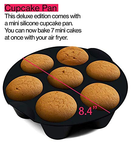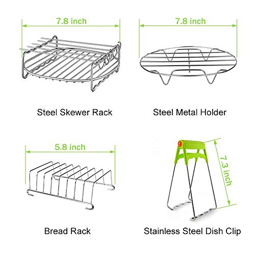 FDA approved and BPA free : 15 pieces air fryer accessories includes 3pcs magnetic Air Frying Cook Time Chart Guide Recipes,100 pcs 8inch air fryer liners, 1 bread rack, 1 cupcake silicone pan, 1 cake barrel, 1 pizza pan, 1 metal holder, 1 multi-purpose rack with skewers, 1 silicone brush, 1 silicone food tong, 1 Dish Clip and 1 silicone mat. It’s enough for you to use it