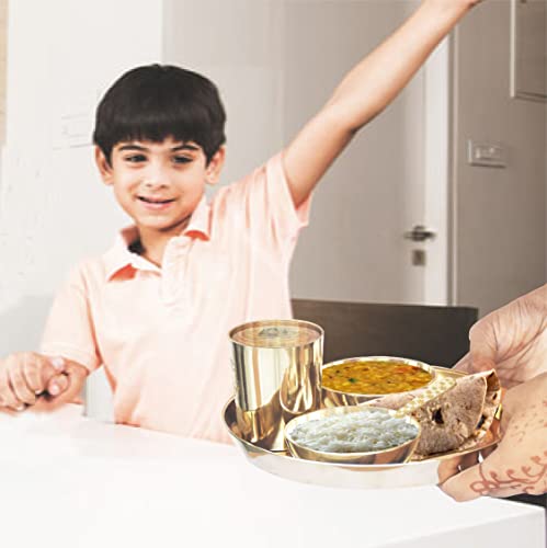 Material: Pure Bronze, Included Components: 1 Dinner Thali, 2 Dinner Bowls, 1 Glass, 1 Spoon