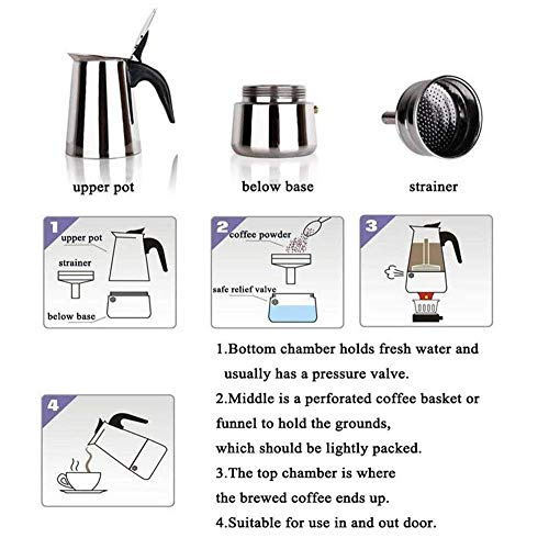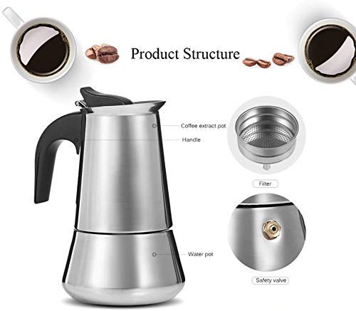APPLICABLE TO INDUCTION COOKER: espresso maker is made of 430 food grade safe stainless steel, applicable to a variety of stoves including induction cooker, electric furnace, ceramic furnace, alcohol furnace and gas stove. Because of its excellent corrosion and rust resistance, it can also be cleaned with a dishwasher.