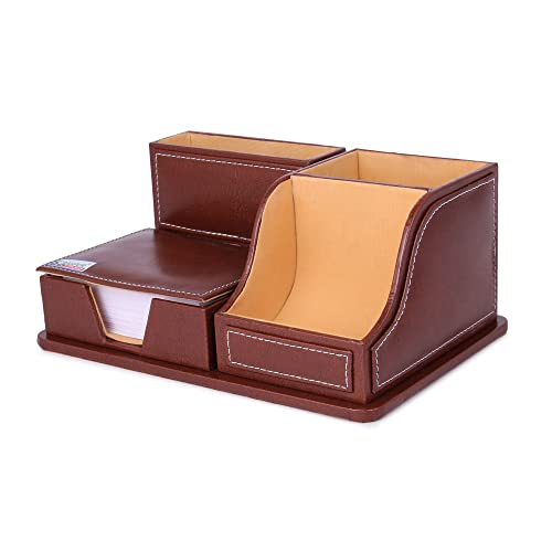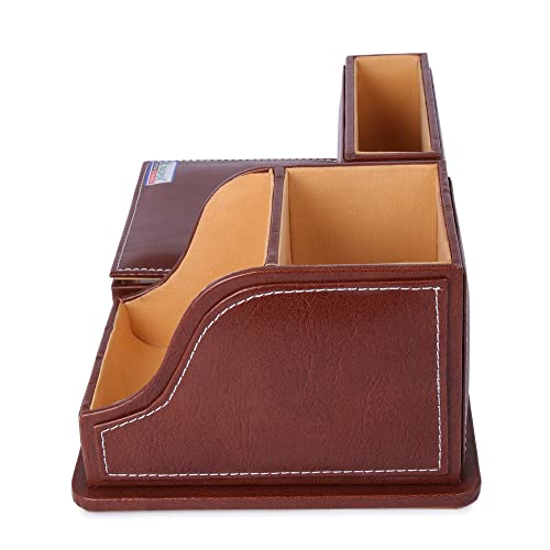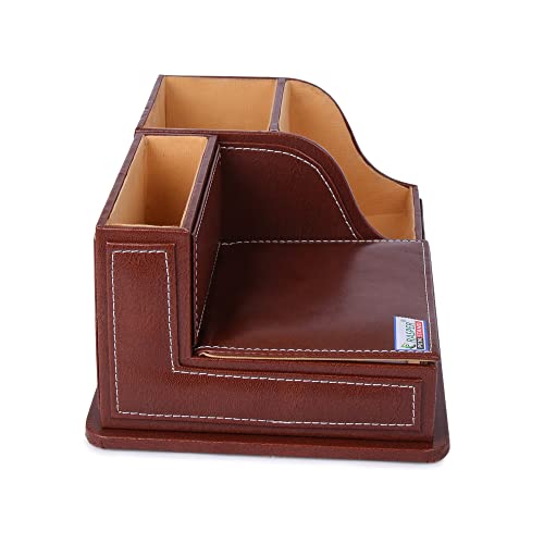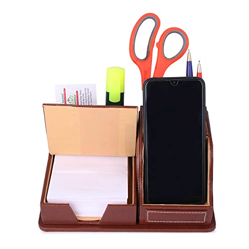 Brown Genuine Leather Multipurpose Desk Organizer With Memo Pad Holder & Mobile Stand For Office Desk Table Top Stand With Card Holder Pen Stand Stationery Accessories Organizer (9×6 Inches)