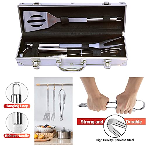Barbecue grill tool set is well made of sturdy stainless steel which makes the set extremely durable to last for a long time. Grill set comes with a lightweight storage case which makes it a great BBQ grill set. The set provides great outdoor BBQ, cooking and grilling accessories and tools for a picnic or party.