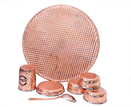 Product Material: Pure Copper, Package Contents: 1 Thali, 1 Bowl, 1 Glass, 1 Plate, 1 Spoon, Capacity: ( Bowl-150 ml, Glass- 200 ml ).