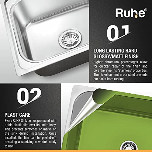 MATERIAL – RUHE Kitchen Sinks are made from PREMIUM STAINLESS STEEL of 0.8mm Thickness for an exceptional resistance to corrosion and rust.