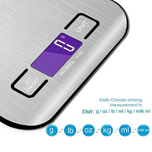 5 WEIGHT UNITS: This kitchen scale features 5 weight units which can be easily and manually switched by pressing the UNIT button: g / kg / oz / lb/ ml / plus a separate mode for weighing liquid or milk volume.