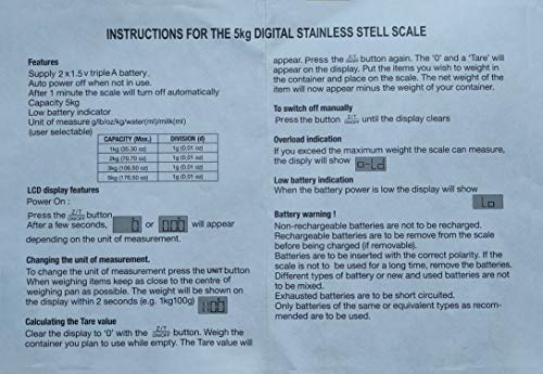 Capacity: 5 Kg; Graduation: 1 gm; Low Battery & Overload indication; Blue Background LCD display; Auto power off when not in use after 1 minute; Material: Stainless Steel, ABS; Size: 18 x 14 x 1.8 cm; Color: Silver; Package includes: 1 x Digital Kitchen Scale, 2 x AAA Battery, 1 x User Manual