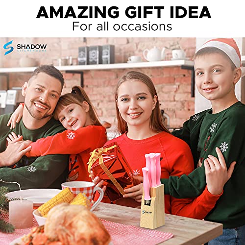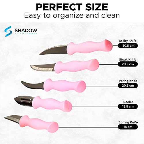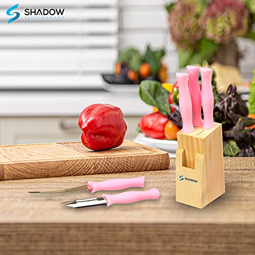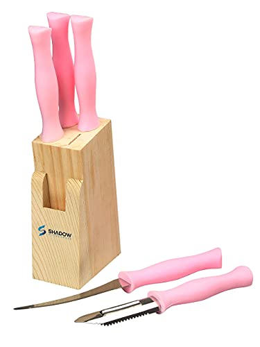 Shadow Kitchenware Knife 6 pcs. sets include: Utility Knife (20.5 cm) = 1 pcs. Steak Knife (20.5 cm) = 1 pcs.Paring Knife (20.5 cm) = 1 pcs.Boning Knife (18 cm) = 1 pcs.Peeler (18.5 cm) = 1 pcs.Wooden Block = 1 pcs