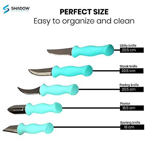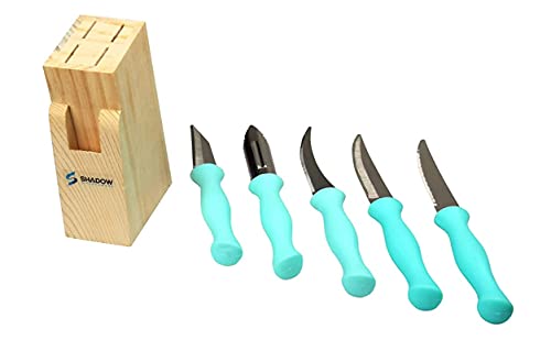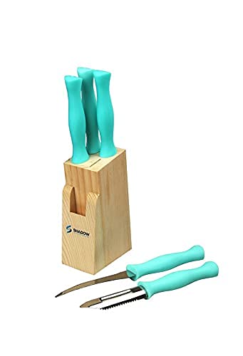 Shadow Kitchenware Knife 6 pcs. sets include: Utility Knife (20.5 cm) = 1 pcs. Steak Knife (20.5 cm) = 1 pcs.Paring Knife (20.5 cm) = 1 pcs.Boning Knife (18 cm) = 1 pcs.Peeler (18.5 cm) = 1 pcs.Wooden Block = 1 pcs