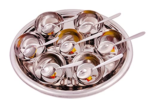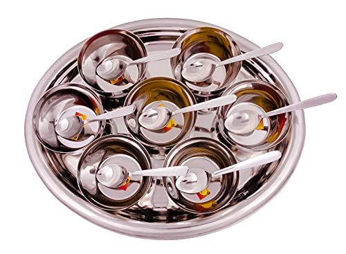 Shiv Shakti Arts (Heavy Gauge) Stainless Steel Serving Set | Katori Bowl With Tray Set | Pudding Set | Dinnerware Thali Set – 15 Pieces (Plane Shinee Design, Length – 41 cm) – 1 Tray , 7 Bowl , 7 Spoon