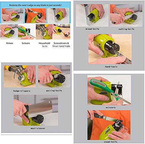 * Use it on steak knives, serrated knives, hedge shears and more. This incredible motorized knife sharpener includes a safety slot for different functions and has a removable attachment for all your sharpening needs – big or small.