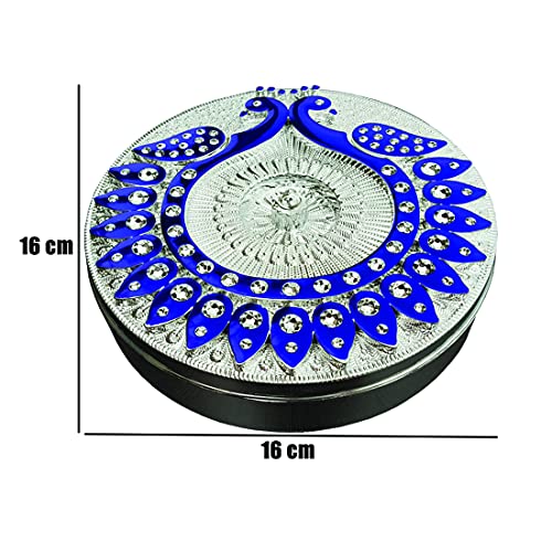 Shoppersduniya Set of Two Silver Peacock Design Round Plastic Air-Tight Dry Fruit Serving | Mukhwas| Chutney | Masala Tray | Jar Box (Blue) 16 X 16 cm (4 Sections)