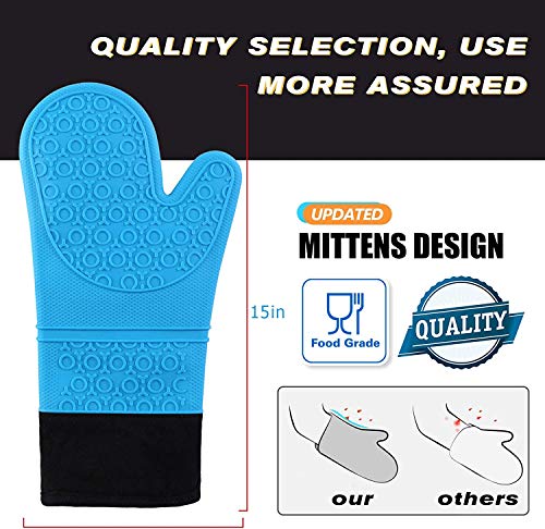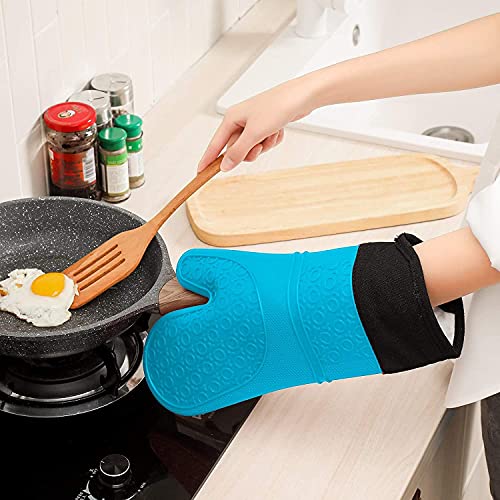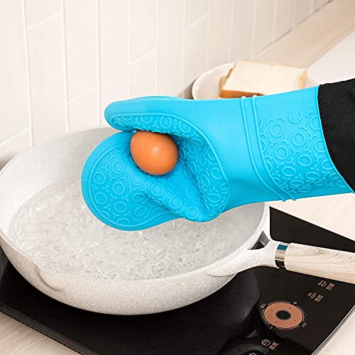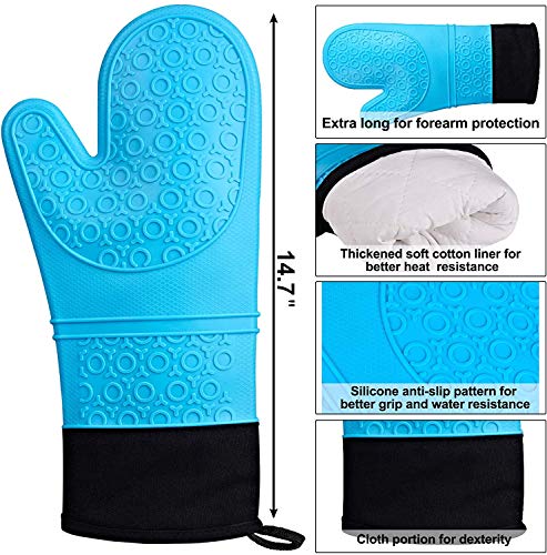 14 ” long anti-scald textured oven mitts. Extra long oven mitts have better protection of fingers, hands and wrists from burns. Textured and non-slip design, the oven mitts allow you to grip pots or other cookware safely without slipping or spilling