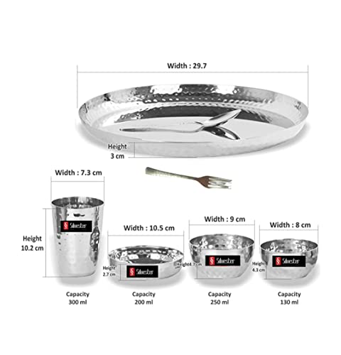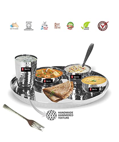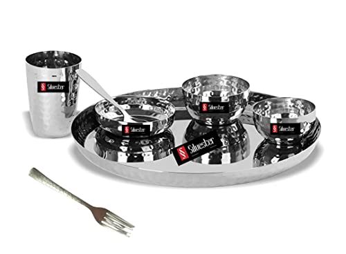 SILVESTER Stainless Steel Handcrafted Hammered Texture Heavy Gauge Mirror Finish Royal Dinner Set of 7 Pcs Serve Food to your Guests Royally with this Supreme Quality Steel Royal Dinner Set and let them enjoy their meals with relish. They will get fascinated by the Royal ambiance it provides to your dining area. Constructed with heavy gauge food grade stainless steel and comes with Hand Made Hammered Texture effect. This effect is specially done by skilled craftsman of India with care and their experience and not by any machine. This product is utterly reliable in all situations whether you have guests coming over or you want a perfect gift to present to your friends or relatives. Storage is not an issue for they can be easily placed on your kitchen shelves. This ultra-modern and stylish kitchenware is an absolutely tempting deal. The Material used in the making of these utensils makes them strong enough to last a decade and the lustrous finish will retain forever. Specially made for Home, Restaurant, and Catering Services. Besides being really useful, this Stainless-steel thali Set can be a perfect gifting option and you will not have to think twice before presenting this to your loved ones because what is better than gifting good health disguised as a wonderful item. This Royal Dinner Set comprises of : 1 Dinner Plate, 1 Glass, 1 Spoon, 1 Fork, 1 halwa plate, 2 big bowl