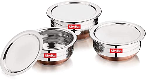 Steel Handi Set urli Kitchen Serving Cooking dinning Bowl biryani and kadhai Serveware/Tableware/Dish donga Set Cooking Handi Set Pot Vessel with Lid Cookware Set Stainless Steel with Copper Bottom Cook and Serve Handi with Lid saucepot pan 3 Piece size:- 750 ML,1000 ML,1500 ML