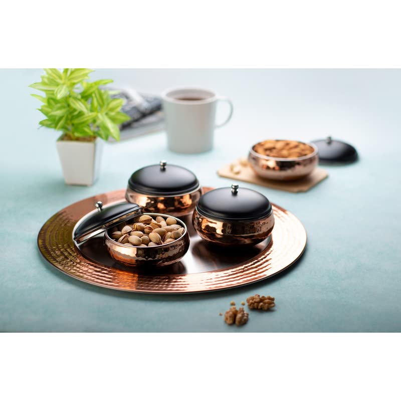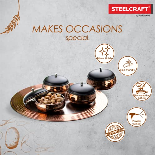 Be the first to review “Steelcraft Premium Stainless Steel Steel Snack Set of 5 Pcs (1 Serving Tray, 4 Bowls with lid (290 ml) per Bowl with Outside Rose Gold Colour Coating)”