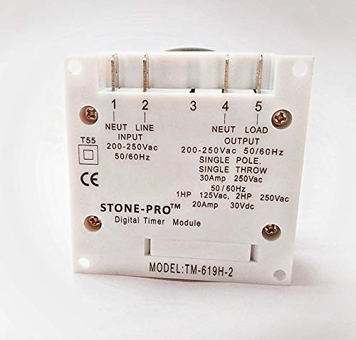 STONE-PRO digital timer programmable controller TM-619-2-h. Replaceable battery. This 24 hour timer switch suitable for water heater, water dispensers, street lamp, staircase lamp, advertising lamp boxes, breed aquatics, irrigation, agriculture, office power auto control, in anywhere need time control in civilian, home or industrial, etc. It can be used to set 17 programs to control on and off of electric appliance in 24 hours .It can be programmed to avoid the peak of power and it can distribute power in time limit to save energy. Features: 17 on or off programs can be set per day. Easy to replace battery. Option to select days oy days of the week on which the programmed functions to be performed. LED power indicator. Manual over ride switch. LCD on screen displays on and off switching status. With lithium battery inside for memory back up. With daily weekly and impulse programs. time switch with LCD display 4 pin. Easy connection settings. Technical Specifications: Input voltage is 200 ~ 250 VAC, frequency is 50/60Hz. Contact: Single pole, single throw 30 A, 250 V AC or 20 A, 30V DC. Running Accuracy: 1 second or day at 20 degree Celsius. Minimum time setting is 1 minute. Load resistive 30A, inductive 20A. Memory back up lithium battery inside the timer. To be charged 3 hours before first use. Package Contents: Original box, net weight 80 grams, packaging weight 105 grams. Colour: White