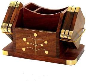 STS Beautiful Wooden Coasters Set of 6 with Pen and Card Organizer, Spoon Holder -Handmade Coasters with Brass Work for Home, Kitchen, Bar, Dining Table & Office Desk with Modern Design