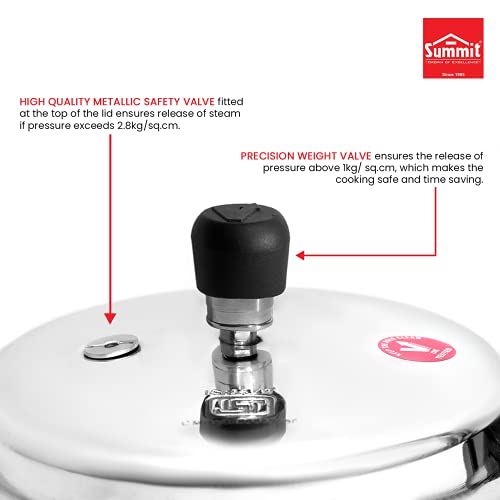 High quality metallic safety valve fitted at the top of the lid ensures release of steam if pressure exceeds 2kg/sq.cm.Ergonomic Bakelite cool-touch handles prevents transfer of heat making it easy to hold and grip while cooking.