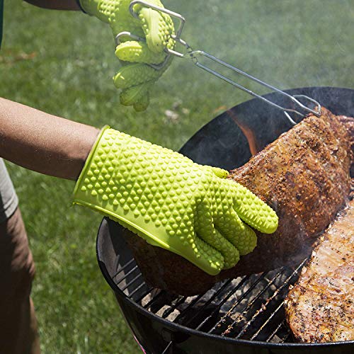 BBQ Mitt: Our gloves are waterproof and dishwasherable. You can rinse food, oil, marinades, juice right off, simply toss them in the dishwasher or throw them in the sink. Maximum Protection: Our non-slip five finger exclusive flame design allows you to move hot items safely with a strong grip.This one size fit for most ,but too small or too big hands are not very suiatble.Heat resistant: Can hold up to 446 °F/230℃ for 8-10 seconds, or a long period under 374°F/190℃, perfect for working by th