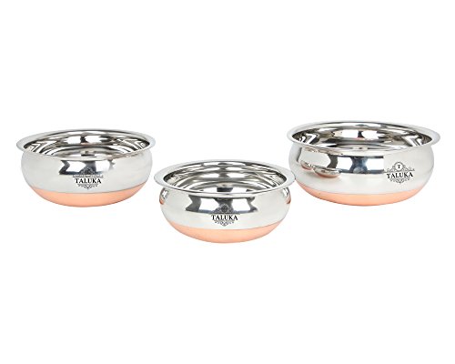 Taluka handi cookware 3 pcs. Set – “Copper bottom – superior quality ” is deep vessel height is useful to cook all type of food. Easy to clean and wash, they have very exotic silver shining. Highly durable and made of fine quality stainless steel. Uses:- used for preparing tea, coffee, boiling milk and cooking more such liquid and all type of product. Used for cooking more food compare to frying pan due to its deep vessel height. Compact size makes it easy to store in kitchen cupboards. When not in used smaller container can be stacked inside bigger container saving lot of storage space. This handi / chetty cook and serve ware is stylish and beautiful to look at. It is durable and made of good quality stainless steel material. The 1 handi which can be used for storing , cooking, mixing or serving food items. This set is made from good quality stainless steel making it exclusive and durable. This handi set has been beautifully designed to add grace to your dining experience. It is strong in construction and will not bend or have dents during normal use. Stainless steel is hygienic to use and easy to clean as compared to other materials. All the utensils are of mirror finish and give an elegant look. Used for preparing /cooking food or stylishly serving food. The copper bottom of this cookware makes it efficient for cooking and saves fuel. Features: cook faster and save fuel,copper bottom cookware, good quality stainless steel, hard and durable, easy to clean and wash, exotic silver shining, cooking and storing food, store fresh cuts and curd, store bakery products, serve food and puddings, store knead dough, durable as a daily serve ware set, mix batter and salads. About the brand :- taluka in the business of stainless steel utensils, kitchenware and other kitchen products.