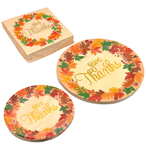 COMPREHENSIVE SET. Our Thanksgiving Party Supplies include total 96 count Extra Large Paper Plates, Dessert Plates & Large Napkins. Beautiful ” Give Thanks” Disposable Dinnerware Pack for 24 Guests. (24 – Large 10.5 Dinner Plates With Gold Foil Wording, 24 – Matching Appetizer/Dessert Plates With Gold Foil Wording, 48- Large Gold Foil Stamped Dinner/Luncheon Size Napkins With Gold Foil Wording) elegant maple leaves thanksgiving design around the edges.