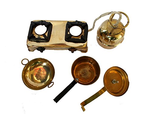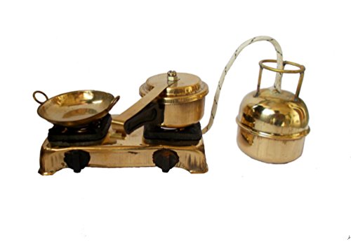 THE DIGITAL STORE Brass Vintage Antique Gas Chulha, Cylinder, Kadai with Pressure Cooker Toys for Kids (Gold)