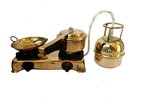 THE DIGITAL STORE Brass Vintage Antique Gas Chulha, Cylinder, Kadai with Pressure Cooker Toys for Kids (Gold)