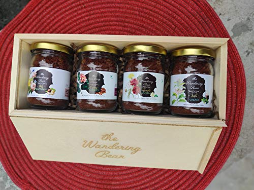 Bespoke Hand crafted Coffee in a LUXURIOUS BOX ! Share a gift of Health and Love with The Wandering Bean’s Beautifully arranged assorted Gourmet Coffee Hamper. An elegant handmade coffee box made of wood which is perfectly crafted and has a classic finish look! This alluring coffee box is perfect for every occasion. Flavors included are Nutty Hazelnut, Creamy Caramel, French Vanilla and Irish Cream). Each flavor is 40g X 4 Flavors (in all 80 Cups of Coffee)